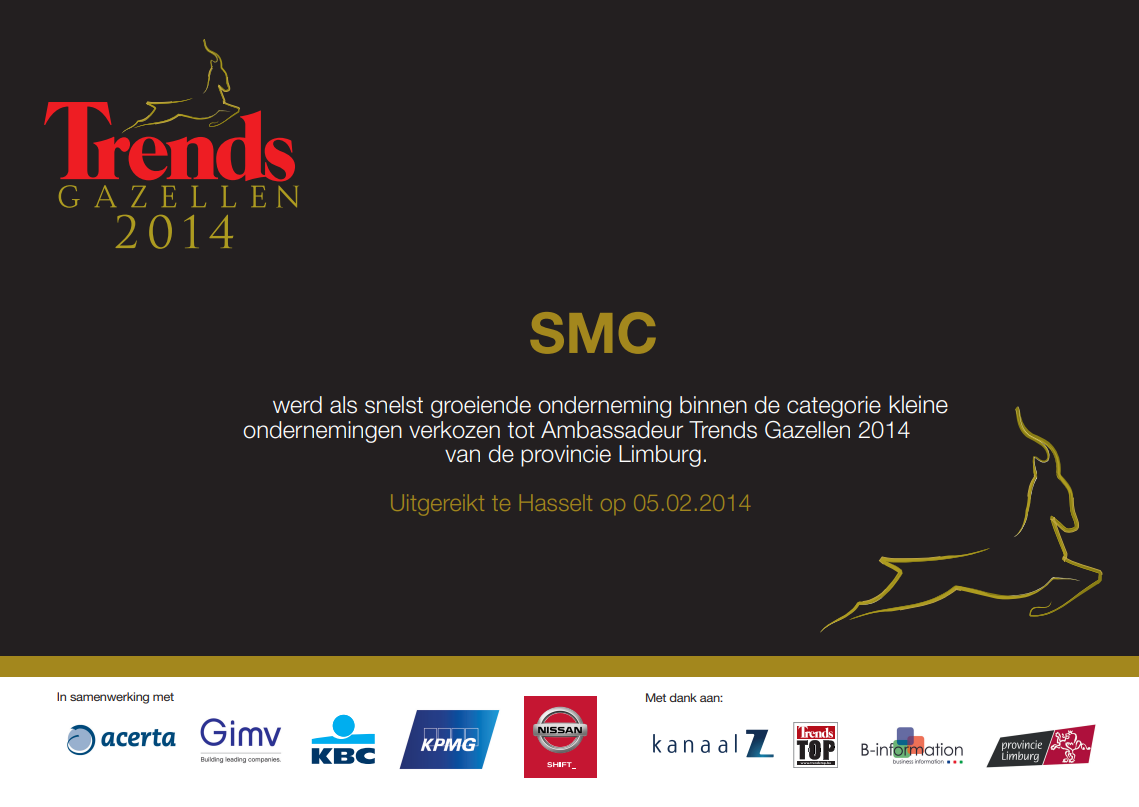 SMC was chosen by Trends as the winner and Ambassador “Gazelle Award 2014” as the fastest growing company in the province of Limburg.